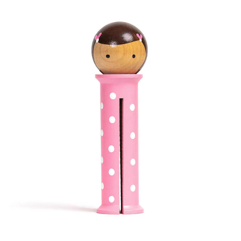 Zoey has a pink white dot dress with round sweep hairstyle, brown hair and two mini heart barrettes hair accessory.